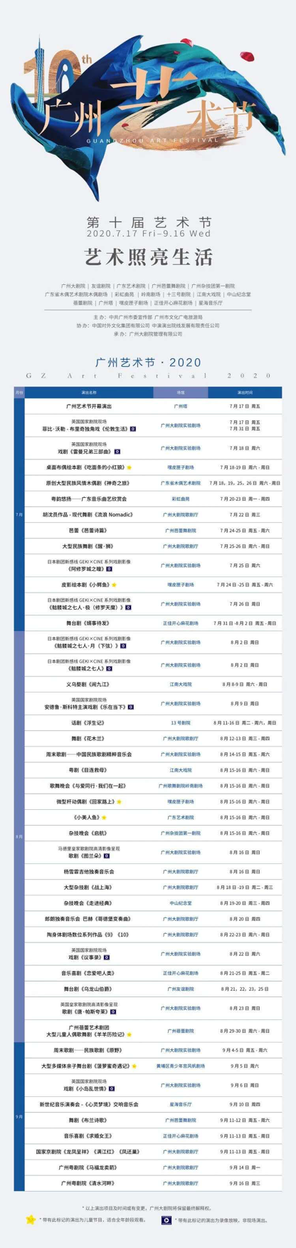 第十屆廣州藝術(shù)節(jié)由廣州市委宣傳部、市文化廣電旅游局主辦,中國(guó)對(duì)外文化集團(tuán)有限公司、中演演出院線發(fā)展有限責(zé)任公司協(xié)辦,廣州大劇院承辦,于7月開(kāi)幕,9月閉幕。第十屆廣州藝術(shù)節(jié)主題為“藝術(shù)照亮生活”,全面貫徹習(xí)近平總書(shū)記在文藝座談會(huì)上和廣州考察時(shí)的重要講話精神,緊緊圍繞全面建成小康社會(huì)、粵港澳大灣區(qū)建設(shè)、獻(xiàn)禮建黨99周年開(kāi)展活動(dòng)策劃。同時(shí),加強(qiáng)省市聯(lián)動(dòng)以及與國(guó)家院團(tuán)聯(lián)動(dòng)、中外人文交流互動(dòng),用藝術(shù)講好中國(guó)故事和廣州故事,推動(dòng)中華文化走出去,提升文化自信,打造一個(gè)具有國(guó)際影響力的藝術(shù)節(jié),全面提升廣州城市文化品位,打造社會(huì)主義文化強(qiáng)國(guó)的城市范例,在城市文化綜合實(shí)力方面出新出彩。本屆藝術(shù)節(jié)有來(lái)自各地的優(yōu)秀劇目40余臺(tái),演出場(chǎng)次90余場(chǎng), 參演劇目題材廣泛、品種多樣,涵蓋歌劇、舞蹈、話劇、京劇、粵劇、兒童劇、雜技等藝術(shù)門類。敬請(qǐng)關(guān)注!
