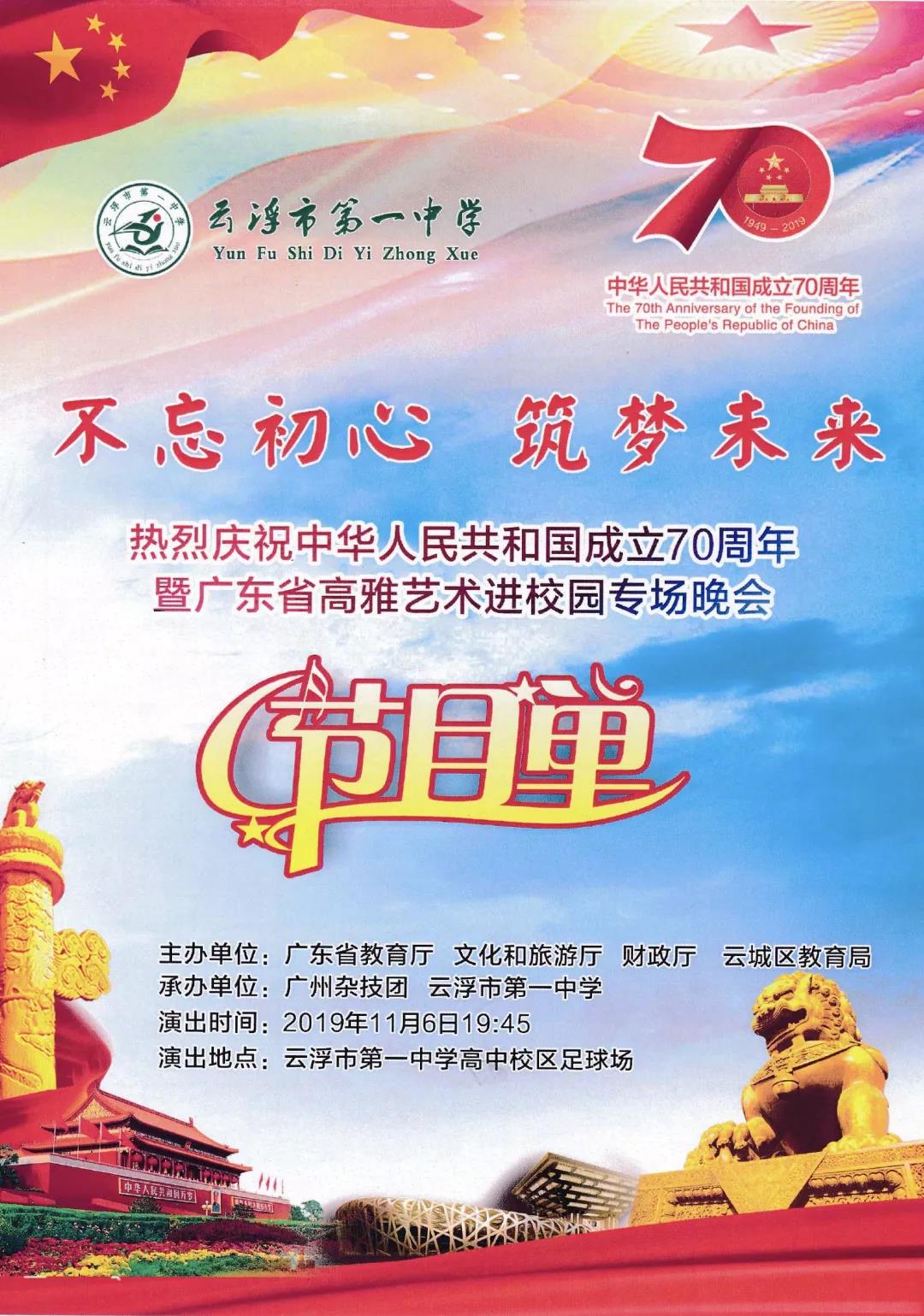 11月6日,為認真貫徹黨的十九大精神,落實相關(guān)文件的要求和部署,大力推進高校美育改革發(fā)展,由廣東省教育廳、文化和旅游廳、財政廳主辦,云浮第一中學、云浮市教育局承辦,廣州市雜技藝術(shù)劇院專場演出的“2019年高雅藝術(shù)進校園”之“雜技藝術(shù)我和你”—中華傳統(tǒng)藝術(shù)鑒賞綜合晚會于云浮第一中學成功舉辦,現(xiàn)場約3000名師生共同觀看了演出。