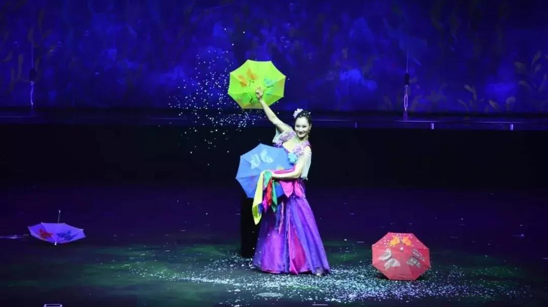 《蝶彩幻影——魔術(shù)》利用七彩的紗巾串成一個個七彩小結(jié),然后在演員的手中快速地將一個個七彩小結(jié)紗巾變成一把把七彩的小傘,有如天女散花般綴落在舞臺。
