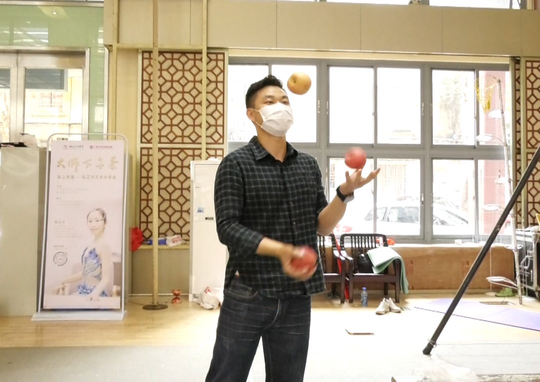 雜技演員金帥給網(wǎng)友們帶來隨時能練的“宅家技能”,3個蘋果輪流拋接,鍛煉靈活手技。