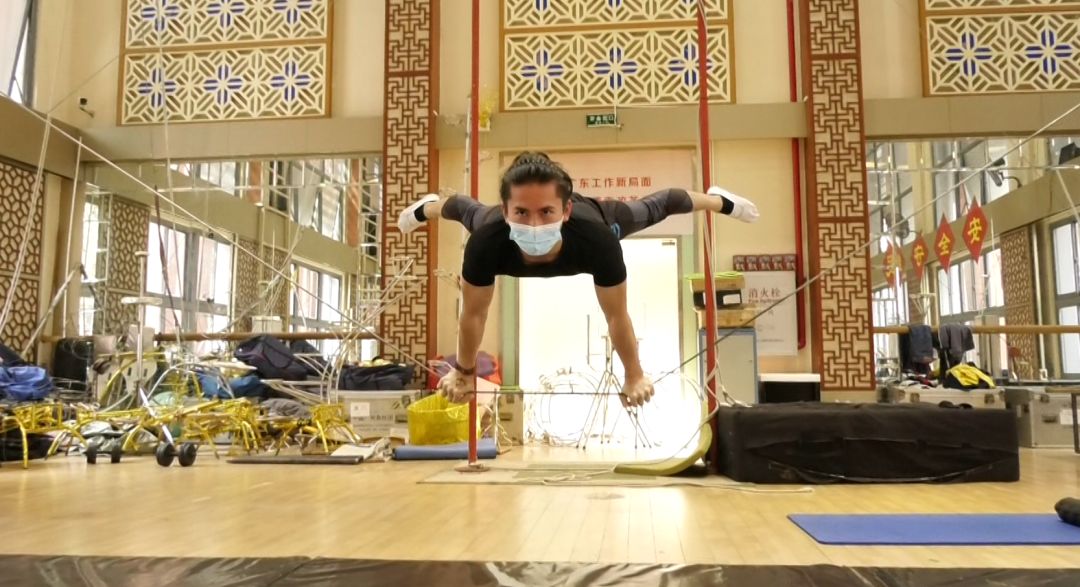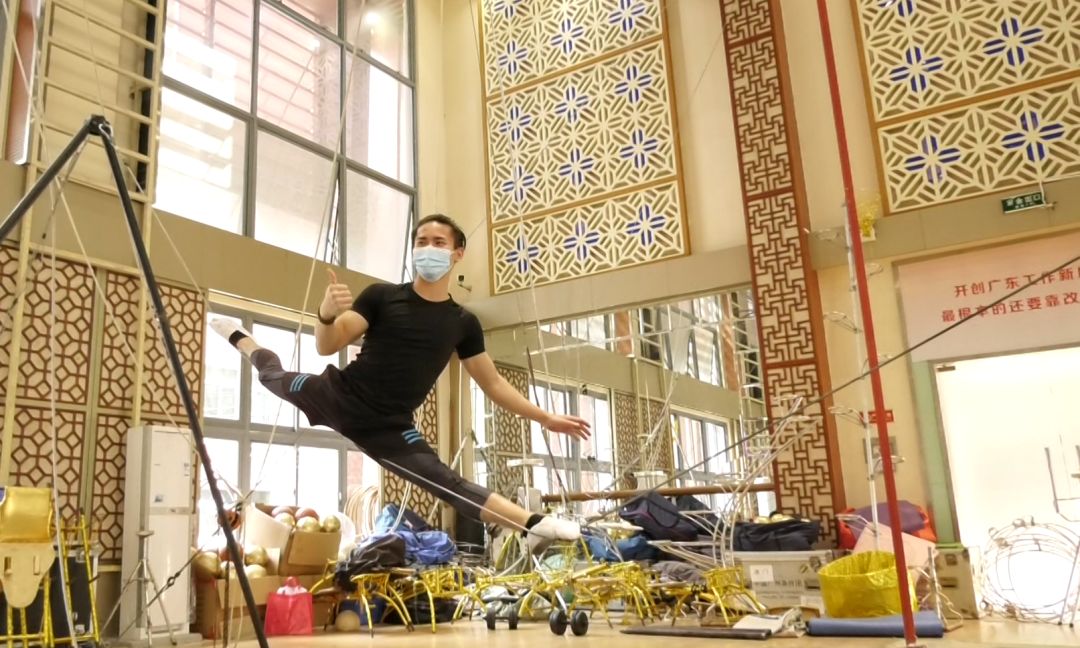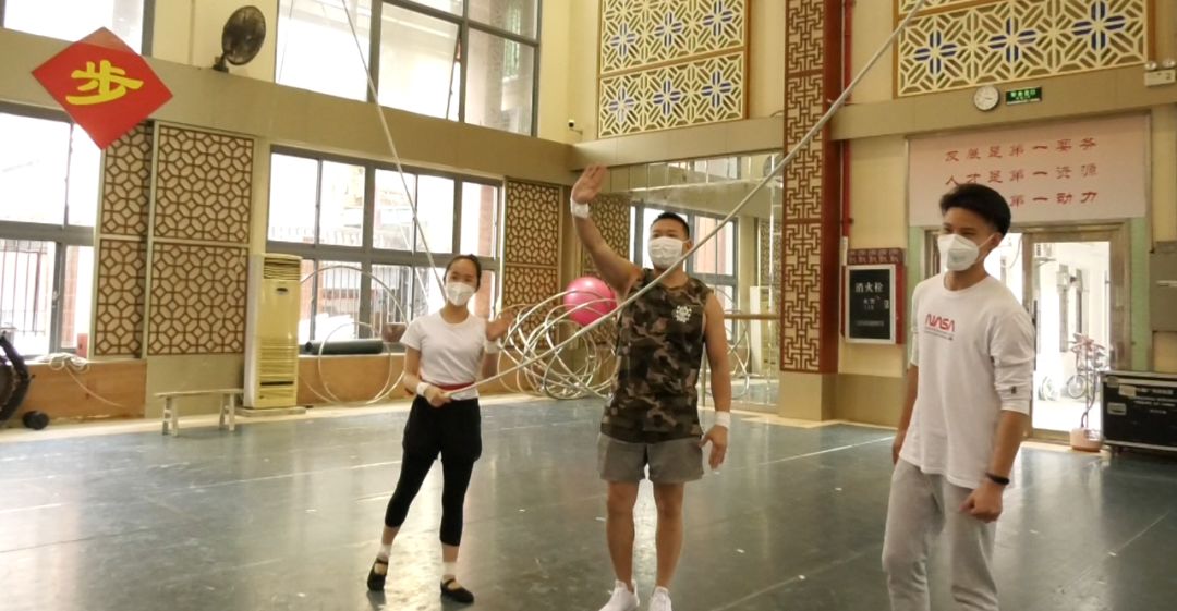 如吳正丹所感嘆的,“肩上芭蕾”的美麗是歷經(jīng)血與汗的苦澀才得以誕生的。在特殊時刻,直播鏡頭中可以看到許多雜技團的演員們自覺戴著口罩積極訓(xùn)練,揮灑汗水磨練技藝。在吳正丹的講解中,技藝精湛的演員們?yōu)橛^眾展示了訓(xùn)練的日常。