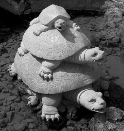 余在杭州日,嘗見一弄百禽者,蓄龜七枚,大小凡七等。置龜幾上,擊鼓以使之,則第一等大者先至幾心伏定,第二等者從而登其背,直至第七等小者登第六等之背,乃豎身直伸,其尾向上,宛如小塔狀,謂之,”烏龜疊塔“。又見蓄蛤蟆九枚,先置一小墩于席中,其最大者乃踞坐之,余八小者左右對列。大者作一聲,眾亦作一聲;大者作數(shù)聲,眾亦作數(shù)聲。既而小者一一至大者前點首作聲,如作禮狀而退,謂之”蛤蟆說法“。此”疊塔說法“,固教習之功,但其質(zhì)性蠢蠢,非他禽鳥可比,誠難矣哉!