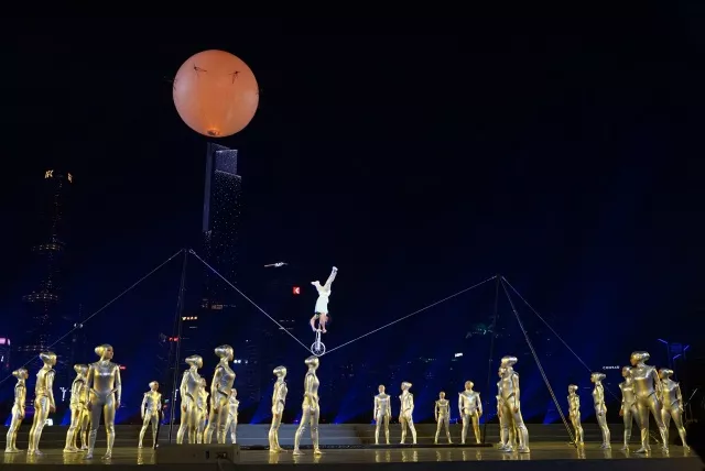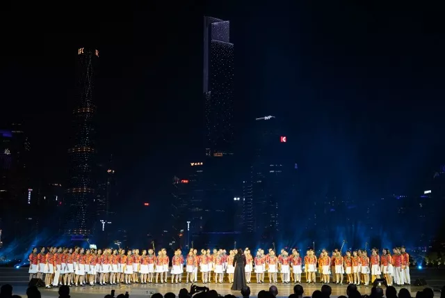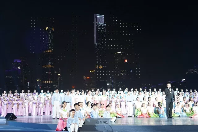Thousands of fine wines welcome distant guests, and the Pearl River sings to make the VIPs drunk. Spectacular performance scene: Guangzhou Symphony Orchestra, 2 singers, 300-person chorus, 1180 drones.